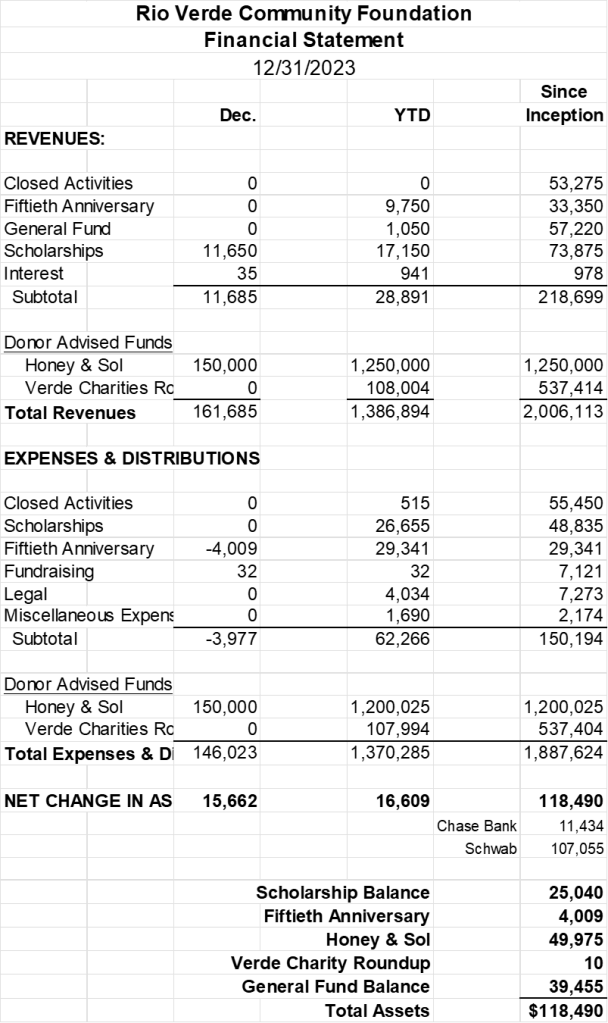 Contributions to RVCF in 2023 totaled $43,641. In addition to the annual granting of Scholarships, the Foundation funded for the Rio Verde 50th Anniversary video and the Rio Verde 50th Anniversary Commemorative Book.