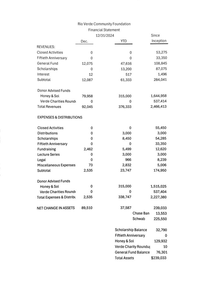 Below is the 2024 Annual Report: The Rio Verde Community Foundation implemented an updated Strategic Plan adding clarity to where and how donor funds will be used. This criteria was developed: